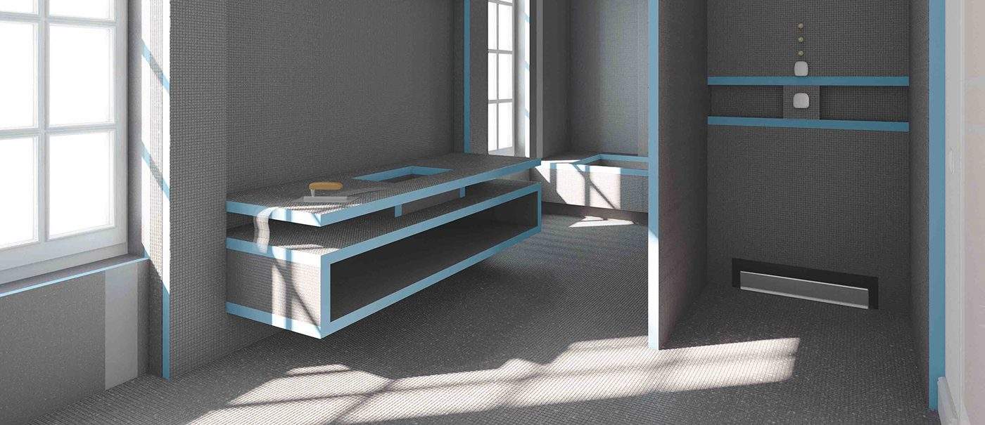 Reinforced cement coating with embedded fiberglass mesh ensures rigidity and strong support for tile finishes.